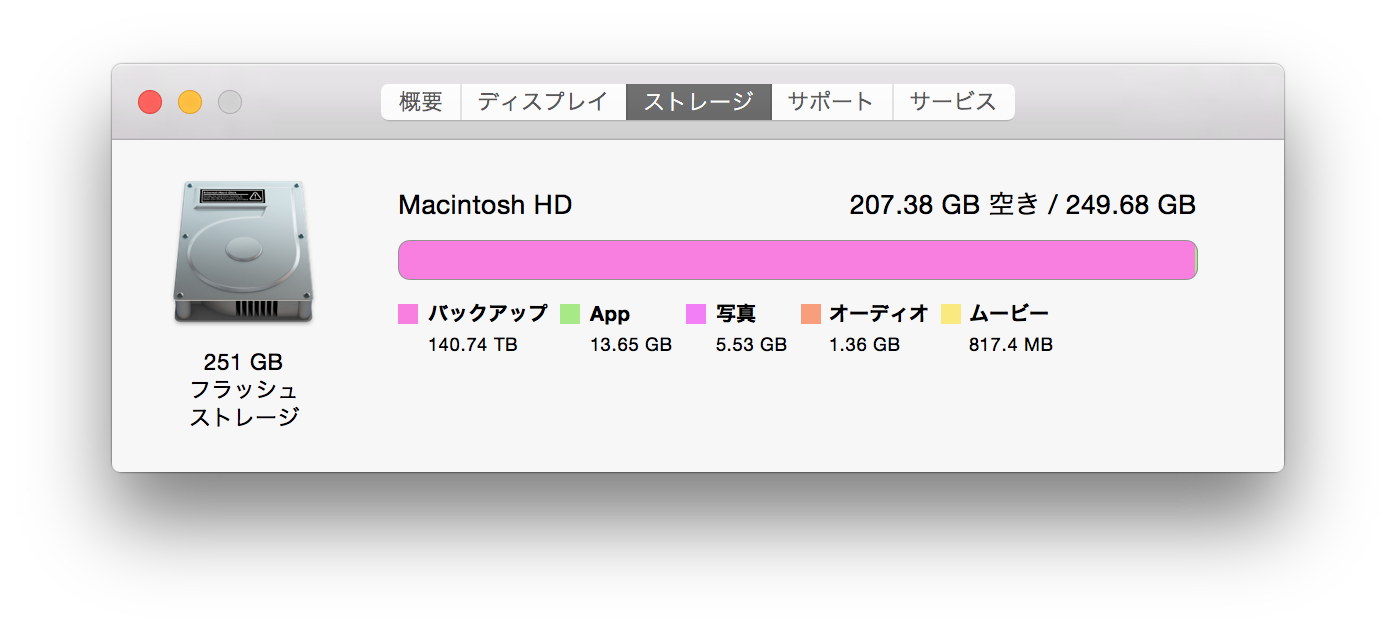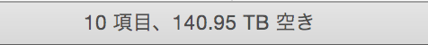 フォルダ内を表示させている時、空容量も見えるようにしてたんですけど、何この140TB空きって…。このMacBookは256GBの容量なのに。